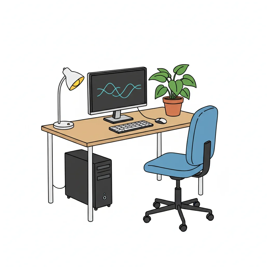 Ein minimalistischer Arbeitsplatz mit Computer, Schreibtisch, Lampe und Pflanze.