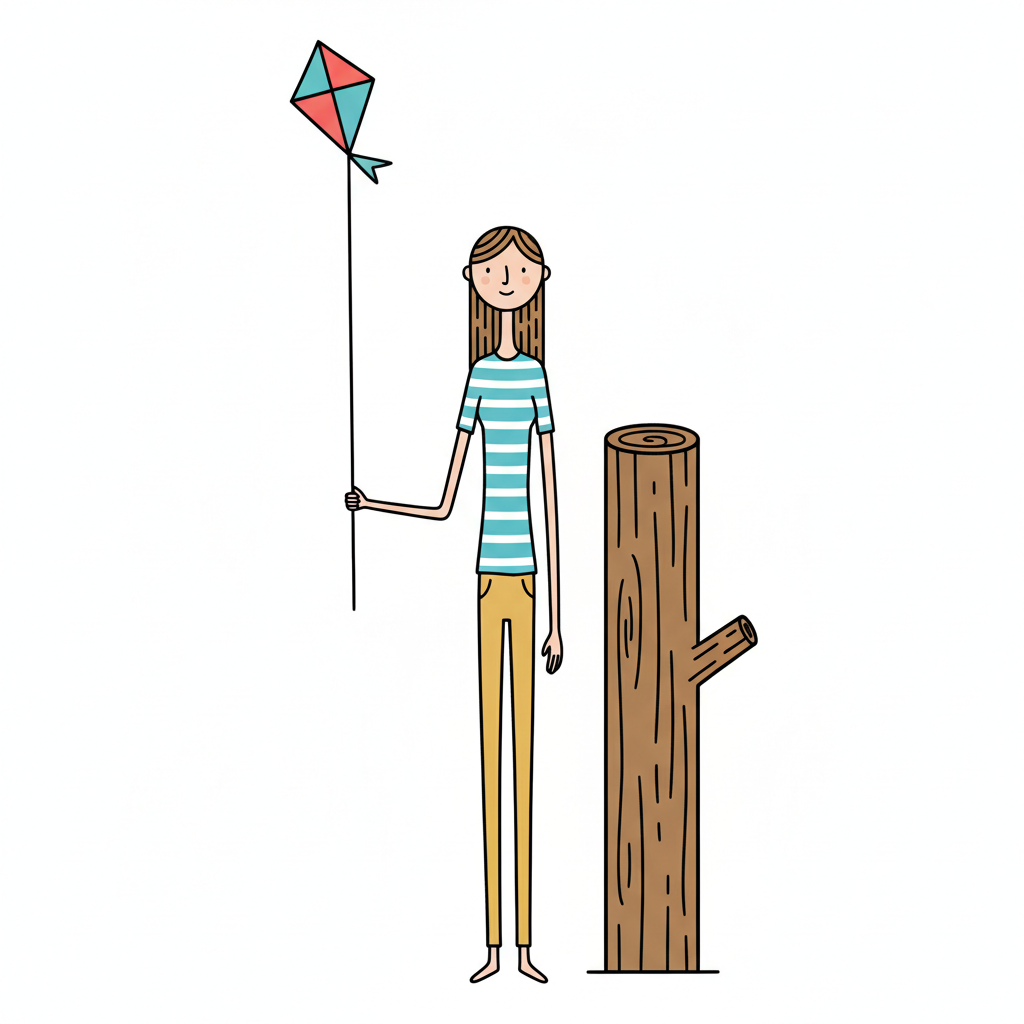 Illustration einer lächelnden Frau, die einen Drachen hält, neben einem Baumstamm auf weißem Grund.