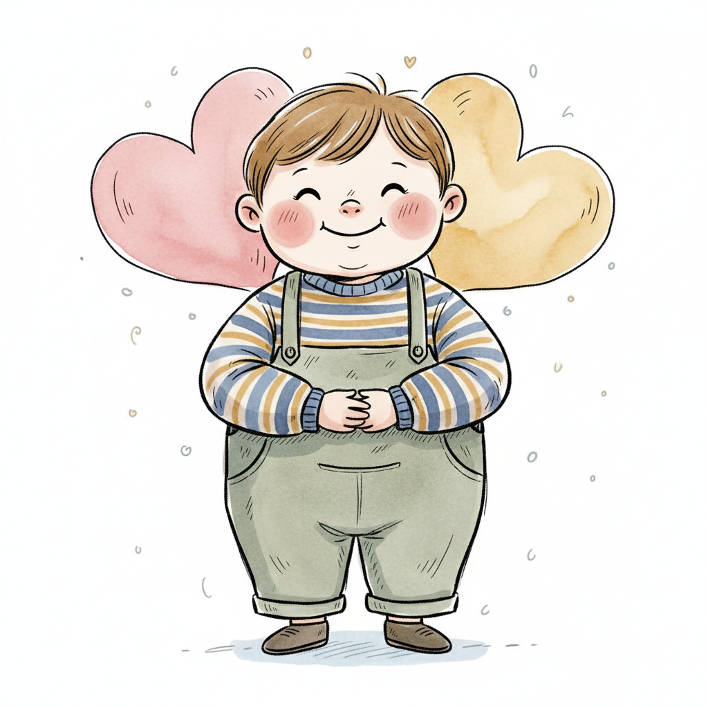 Handgezeichnete Kinderbuchillustration im modernen skandinavisch-nordischen Stil. Minimalistische, freundliche Figur mit einfachen Formen und leicht unregelmäßigen, handgezeichneten Linien. Ruhige, gedeckte Farbpalette, viel freie Fläche, reduzierte Details, sanfte Papier- oder Aquarellstruktur. Warme, ruhige, leicht humorvolle Stimmung, flächige Komposition ohne starke Perspektive, moderner nordischer Illustrationsstil, charmant und zeitlos.