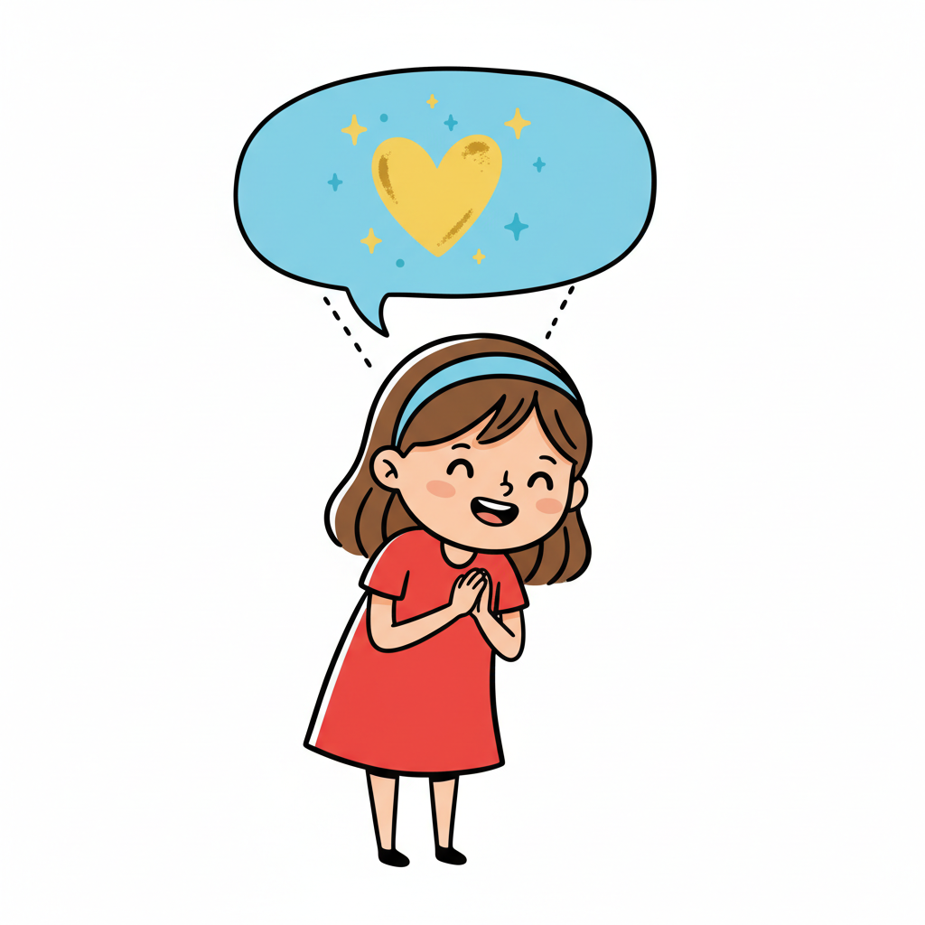 Ein Junge mit gefalteten Händen und Herz-Sprechblase.