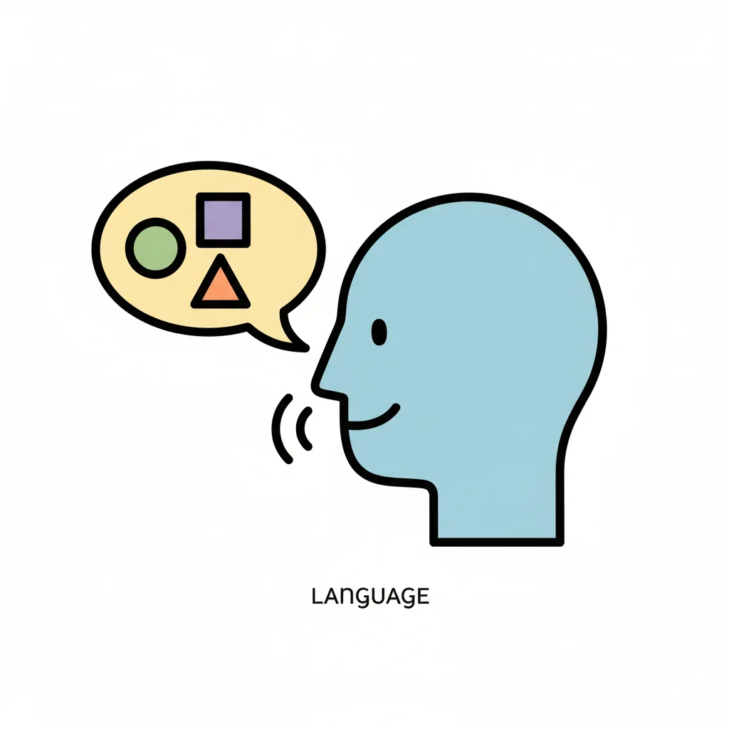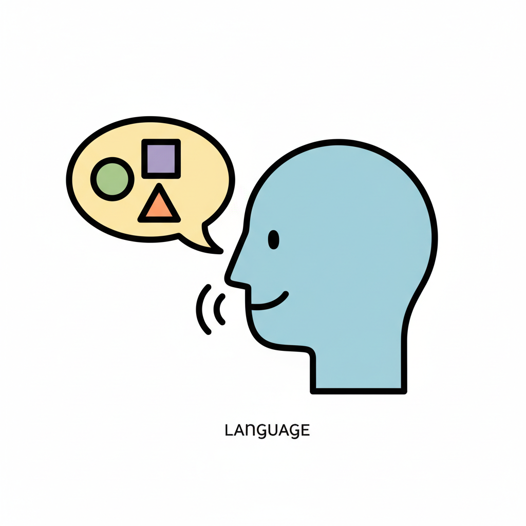 Kopf mit Sprechblase und Formen, die Sprache und Kommunikation darstellen.