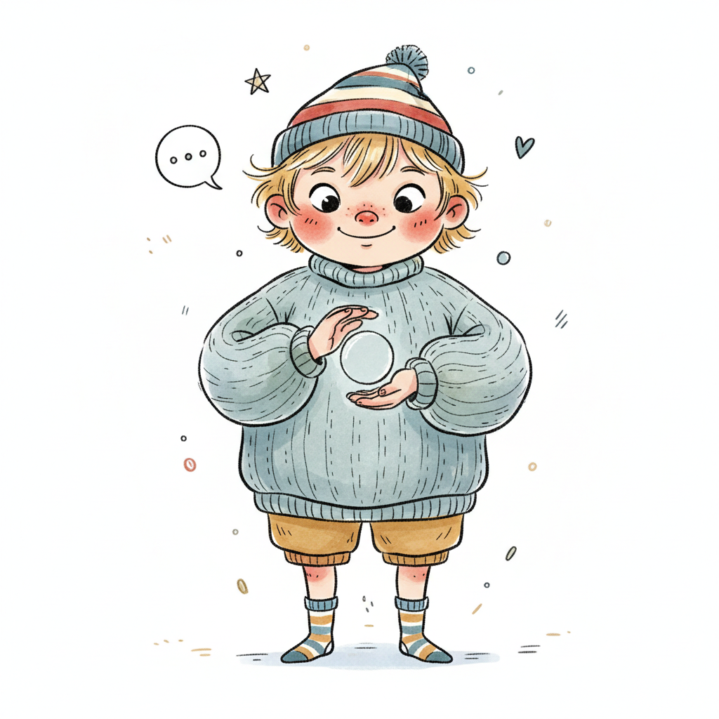 Ein lächelndes Cartoon-Kind in Winterkleidung hält eine leuchtende Kugel in den Händen.