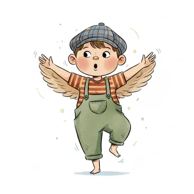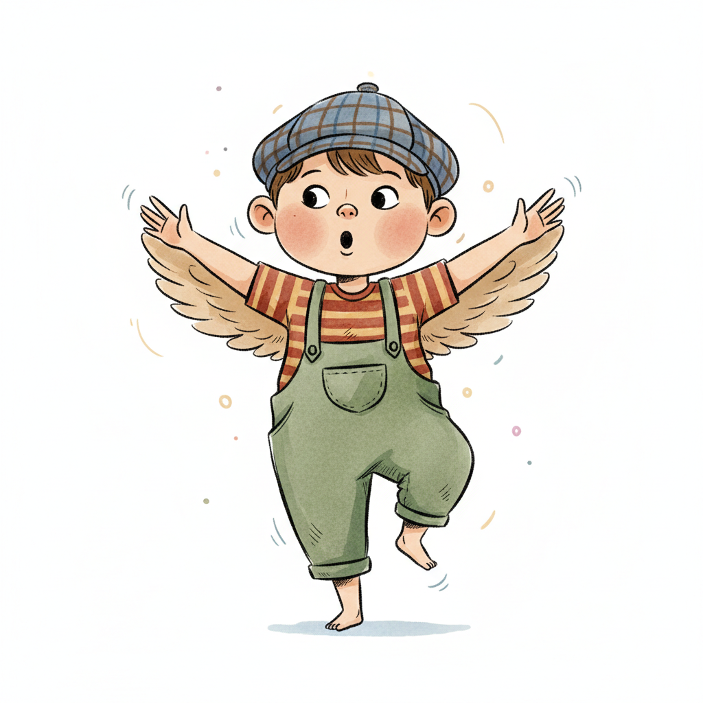 Niedlicher Cartoon-Junge mit Flügeln und Mütze, der überrascht auf einem Bein balanciert.