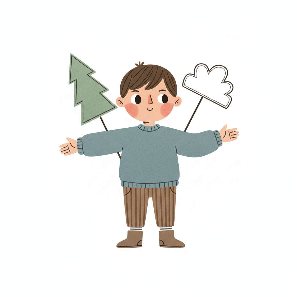 Fröhlicher Cartoon-Junge mit ausgestreckten Armen, umgeben von Baum- und Wolkensymbolen.