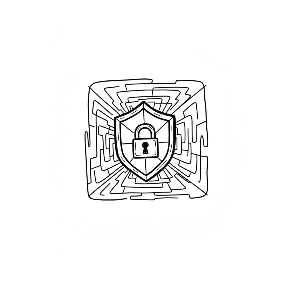 Schwarz-weißes Doodle: Schild mit Vorhängeschloss, umgeben von einem Labyrinthmuster, symbolisiert Sicherheit.