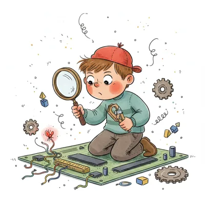 Junge mit Lupe und Werkzeug repariert eine Schaltung, umgeben von Käfern und Fragezeichen. Eine Glühbirne leuchtet auf.