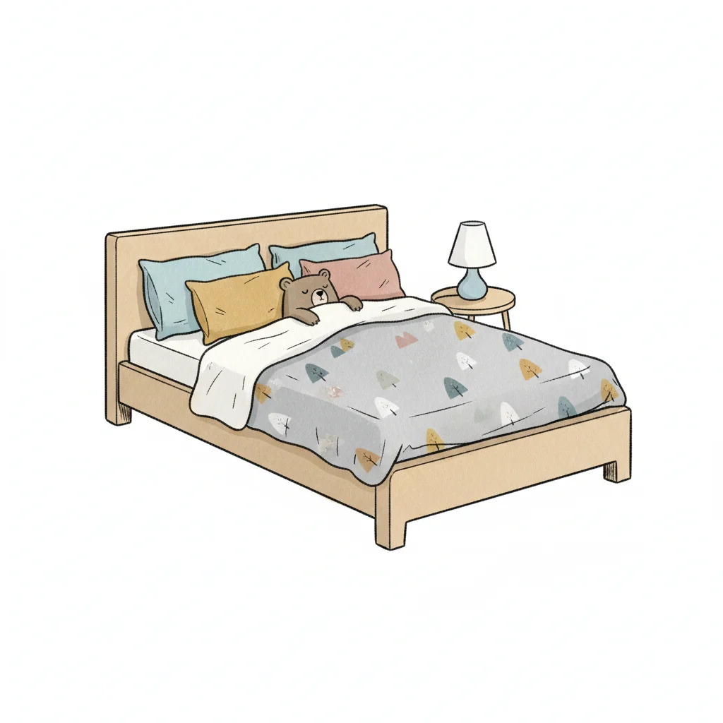 Ein gemütliches Bett mit Kissen, Decke und einem Stofftier.