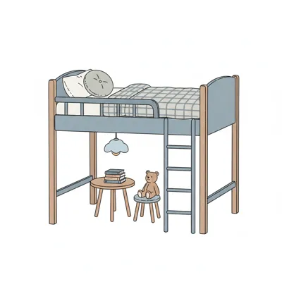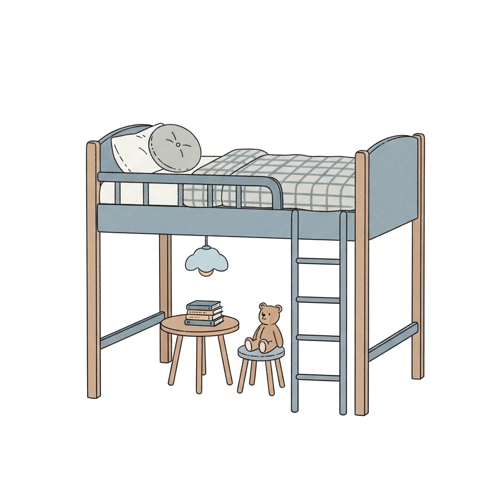 Hochbett mit gemütlicher Decke und Spielzeug darunter.