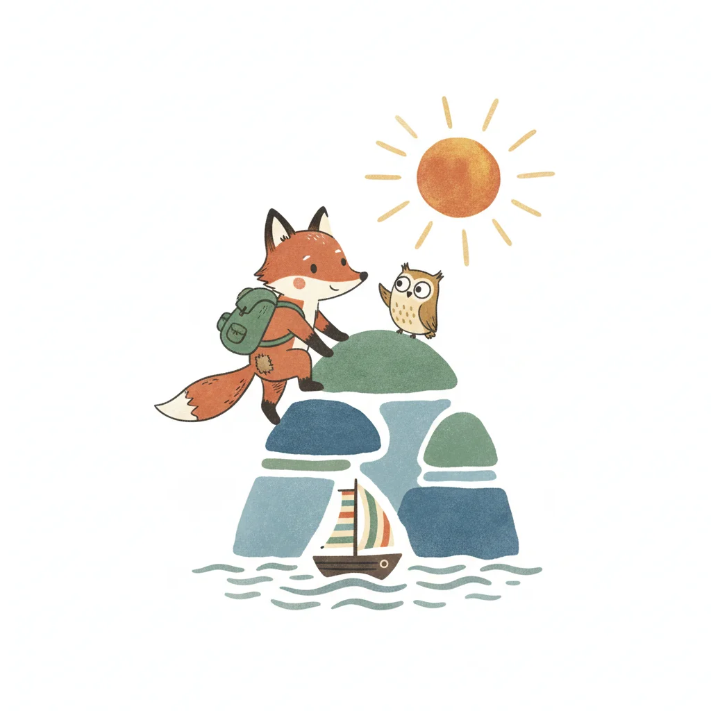 Ein Fuchs und eine Eule entdecken eine bunte Landschaft unter der Sonne.