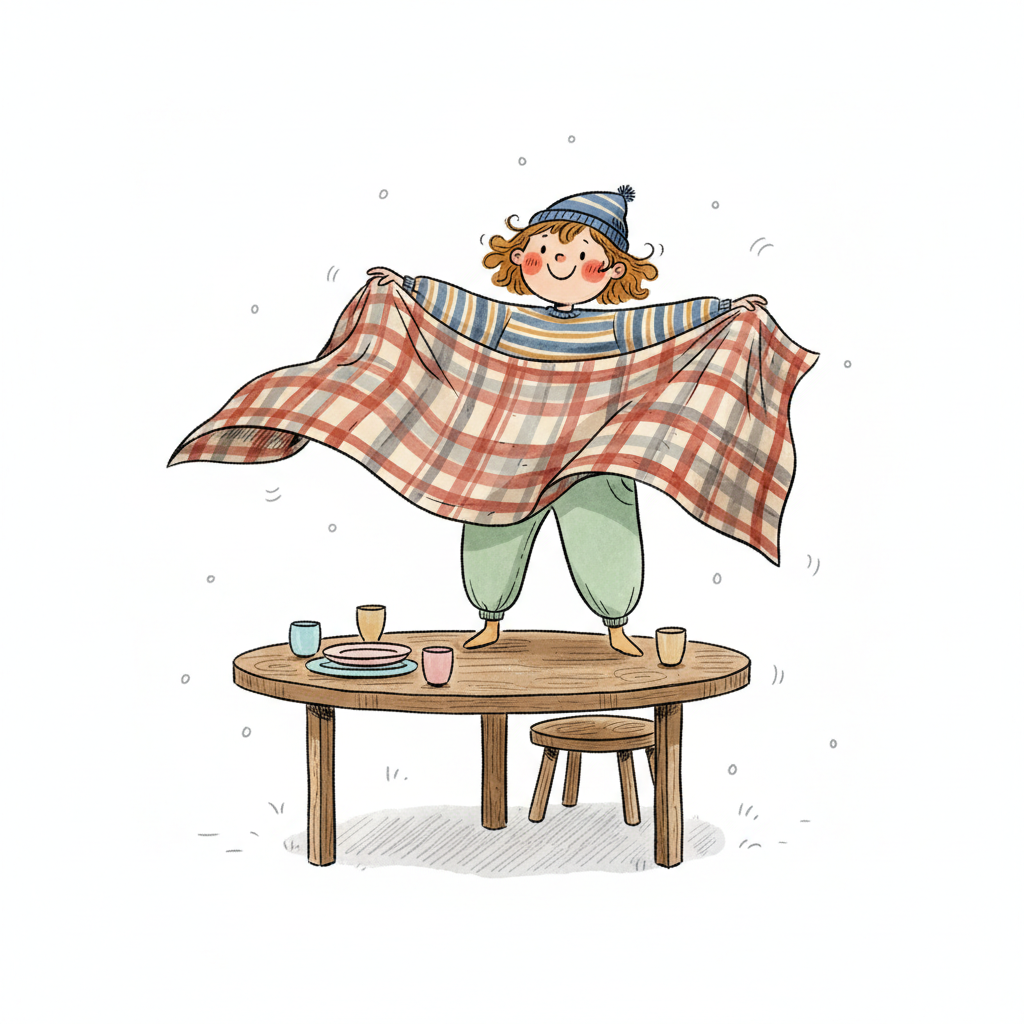 Ein fröhliches Kind mit Mütze steht auf einem Tisch und schwingt eine karierte Decke.