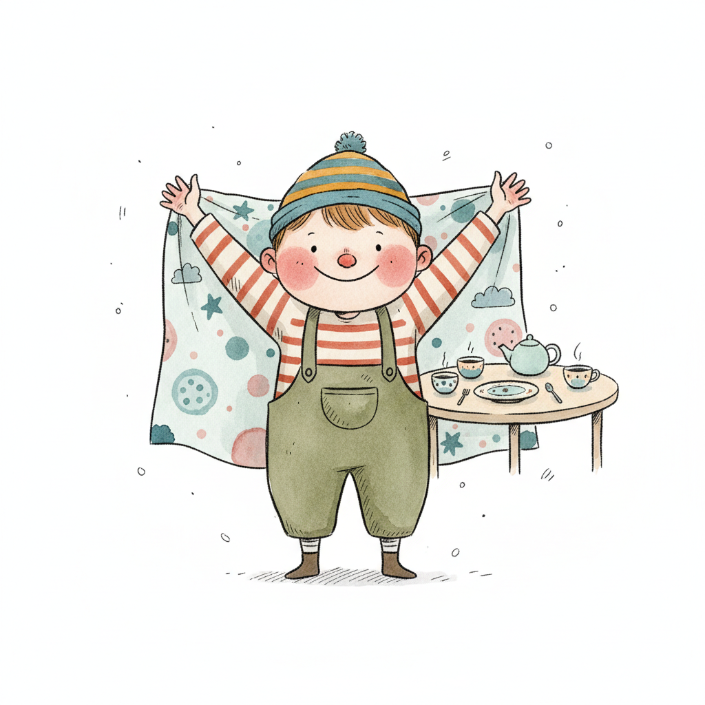 Ein lächelnder Junge mit Mütze und Latzhose hält eine gemusterte Decke hoch, daneben ein Teetisch.