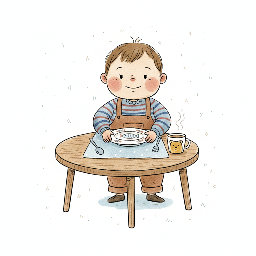 Niedliches Cartoon-Kind sitzt am Tisch, bereit zum Essen, mit Teller und Bären-Tasse.