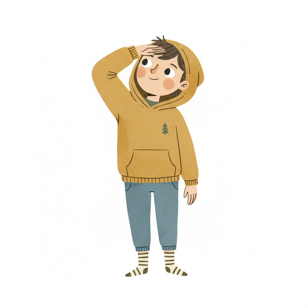 Niedliche, kindgerecht illustrierte Szene mit einem Kind oder einer Person als Hauptfigur, vor rein weißem Hintergrund, im frech-nordischen Aquarell-Skizzenstil. Klare, leicht wackelige Tuschekonturen, sichtbare Pinsel- und Strichtextur, dezente Schraffuren, weiche handgemalte Farbflächen in gedeckten Farben. Einfache, runde Formen. Keine harten Schatten, sondern sanfte, transparente Aquarellschichten. Leicht raue, handgezeichnete Linien statt glatter Vektorkanten. Subtile, vereinzelte Kritzelpunkte oder kleine Details im Hintergrund (wie Pünktchen oder feine Striche), aber keine echte Umgebung oder Landschaft. Die Figur ist mittig zentriert. Insgesamt charmant, humorvoll, warm und handgemacht wirkend. WICHTIG: Das Bild darf ABSOLUT KEINEN TEXT, KEINE BUCHSTABEN und KEINE ZAHLEN enthalten.