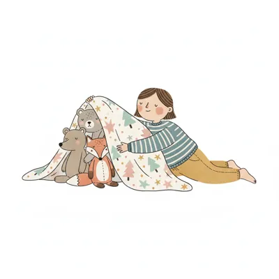 Mädchen spielt mit Stofftieren (Bären, Fuchs) unter einer gemusterten Decke. Gemütliche Szene.