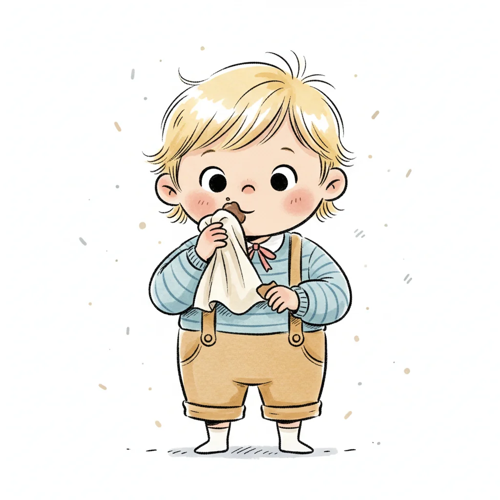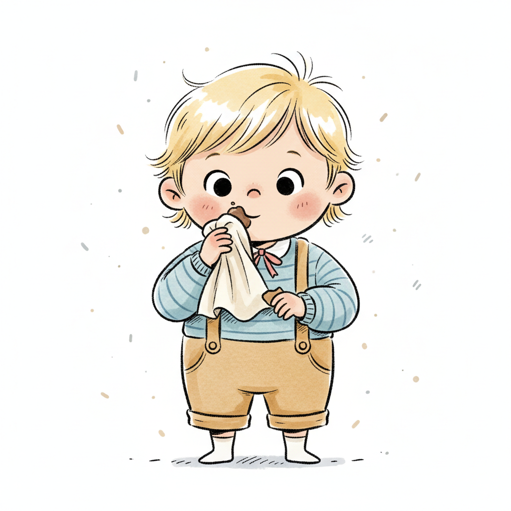 Ein Junge mit blonden Locken, der einen Keks isst und ein Tuch hält.