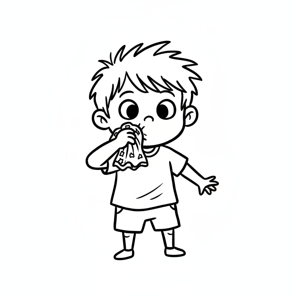 Ein Junge mit unordentlichem Haar, der in ein Taschentuch bläst.