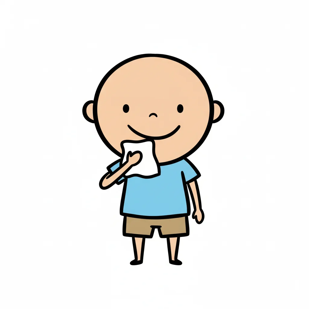Niedliche, kindgerecht illustrierte Szene mit einem Kind oder einer Person als Hauptfigur, vor rein weißem Hintergrund, im frech-nordischen Aquarell-Skizzenstil. Klare, leicht wackelige Tuschekonturen, sichtbare Pinsel- und Strichtextur, dezente Schraffuren, weiche handgemalte Farbflächen in gedeckten Farben. Einfache, runde Formen. Keine harten Schatten, sondern sanfte, transparente Aquarellschichten. Leicht raue, handgezeichnete Linien statt glatter Vektorkanten. Subtile, vereinzelte Kritzelpunkte oder kleine Details im Hintergrund (wie Pünktchen oder feine Striche), aber keine echte Umgebung oder Landschaft. Die Figur ist mittig zentriert. Insgesamt charmant, humorvoll, warm und handgemacht wirkend. WICHTIG: Das Bild darf ABSOLUT KEINEN TEXT, KEINE BUCHSTABEN und KEINE ZAHLEN enthalten.