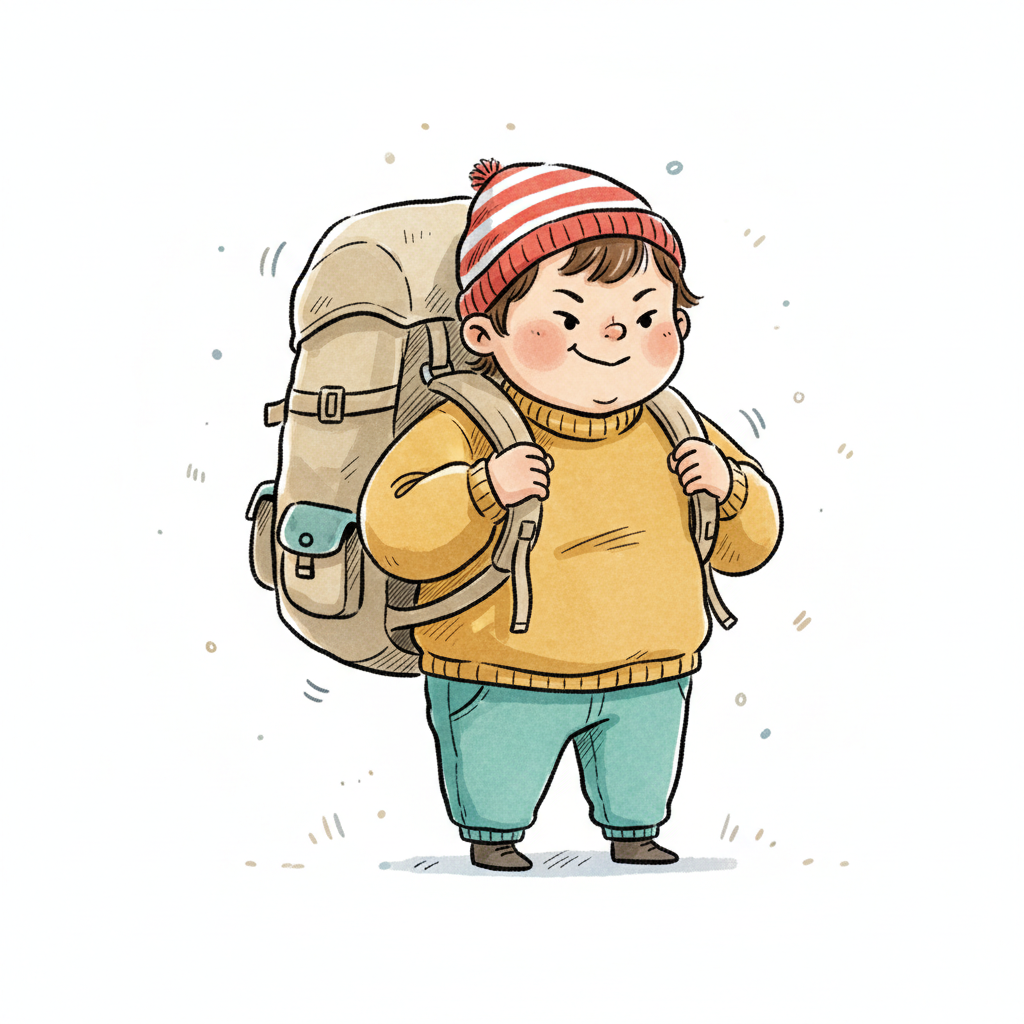 Ein freundlicher Junge mit einem großen Rucksack und Mütze.