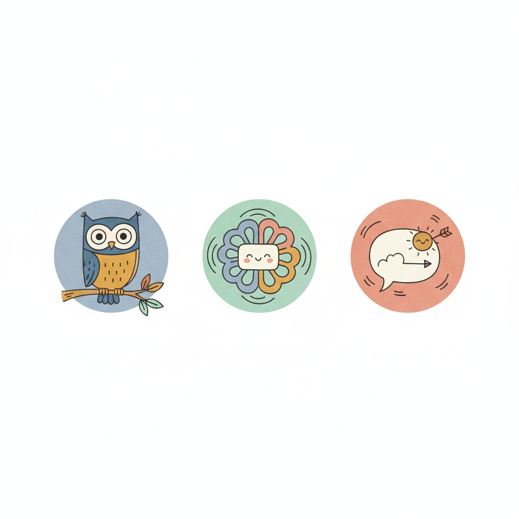 Drei bunte Cartoon-Icons: Eule, lächelndes Gehirn und Sprechblase mit Zielpfeil.