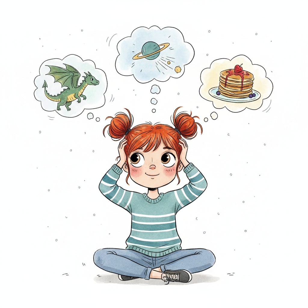 Fröhliches Mädchen mit roten Zöpfen träumt von Drachen, Planeten und Pfannkuchen.