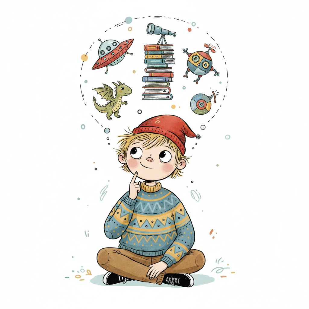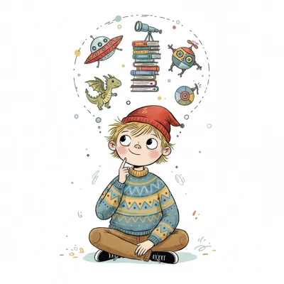 Nachdenklicher Junge mit Gedankenblase voller Bücher, Fantasiewesen und Technik.