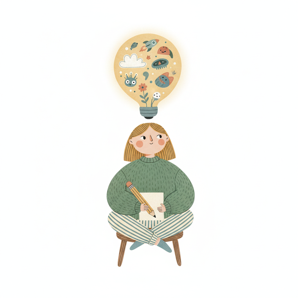 Mädchen sitzt mit Bleistift und Papier, über ihr eine Glühbirne voller kreativer Ideen.