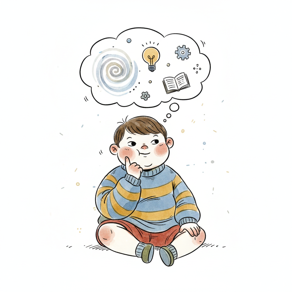 Ein nachdenklicher Junge sitzt mit einer Gedankenblase voller Ideen, Wissen und Mechanik.