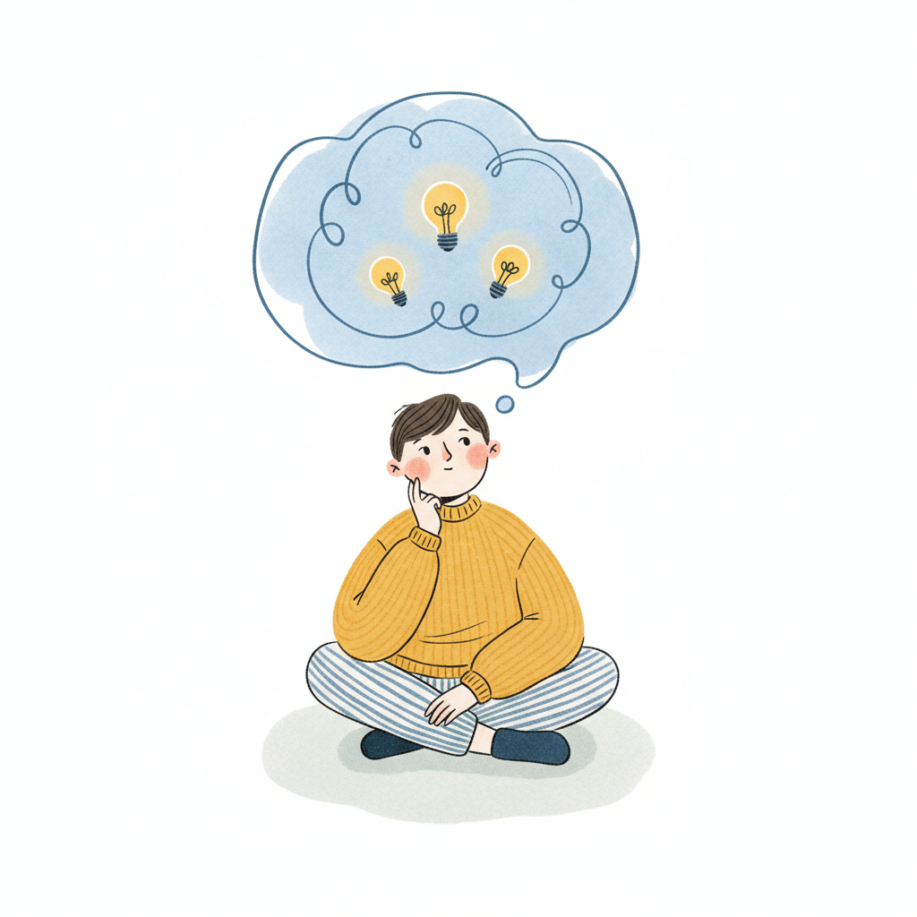 Ein nachdenklicher Junge sitzt und überlegt, umgeben von Gedanken an Ideen, Fragen und Lösungen.