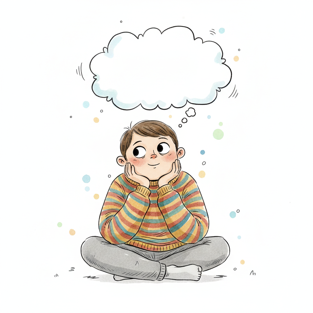 Niedliche, kindgerecht illustrierte Szene mit einem Kind oder einer Person als Hauptfigur, vor rein weißem Hintergrund, im frech-nordischen Aquarell-Skizzenstil. Klare, leicht wackelige Tuschekonturen, sichtbare Pinsel- und Strichtextur, dezente Schraffuren, weiche handgemalte Farbflächen in gedeckten Farben. Einfache, runde Formen. Keine harten Schatten, sondern sanfte, transparente Aquarellschichten. Leicht raue, handgezeichnete Linien statt glatter Vektorkanten. Subtile, vereinzelte Kritzelpunkte oder kleine Details im Hintergrund (wie Pünktchen oder feine Striche), aber keine echte Umgebung oder Landschaft. Die Figur ist mittig zentriert. Insgesamt charmant, humorvoll, warm und handgemacht wirkend. WICHTIG: Das Bild darf ABSOLUT KEINEN TEXT, KEINE BUCHSTABEN und KEINE ZAHLEN enthalten.