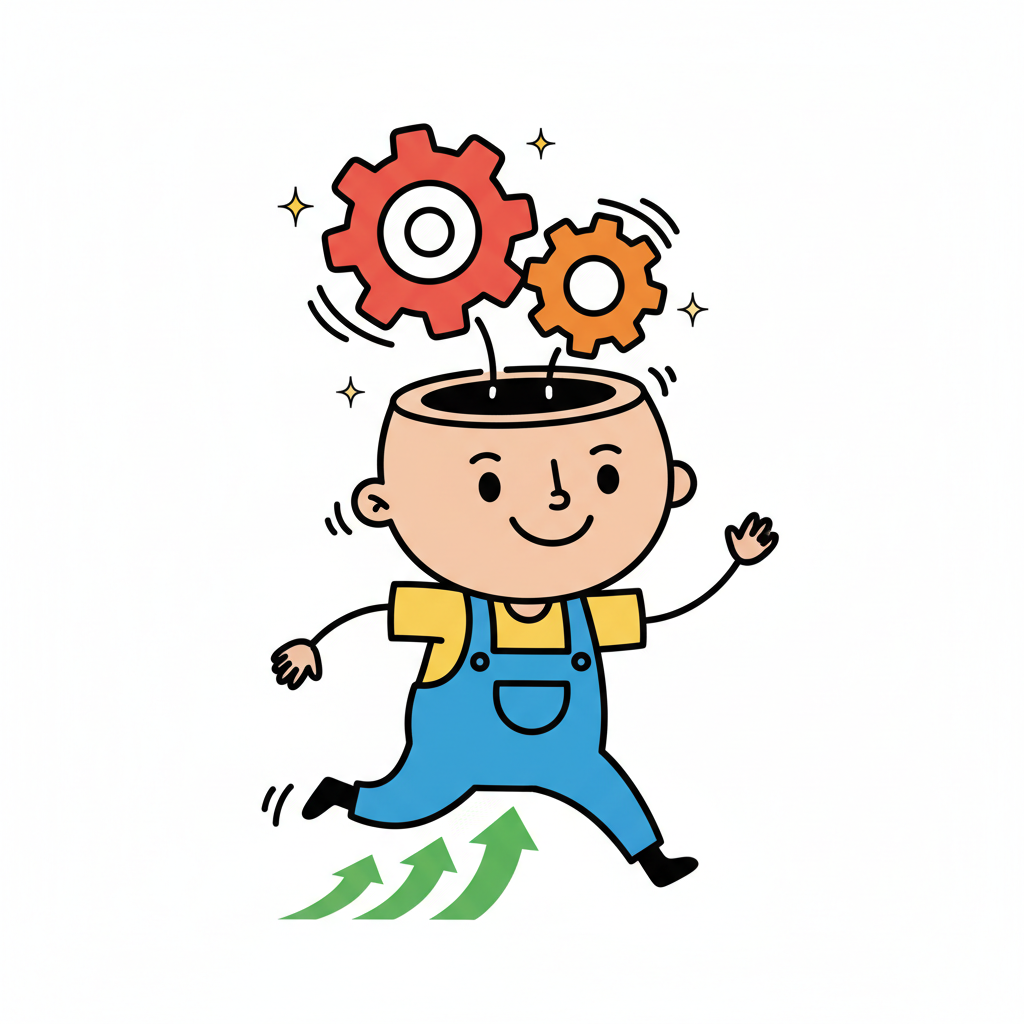 Glückliche Figur rennt mit Zahnrädern im Kopf, grüne Pfeile symbolisieren Fortschritt.