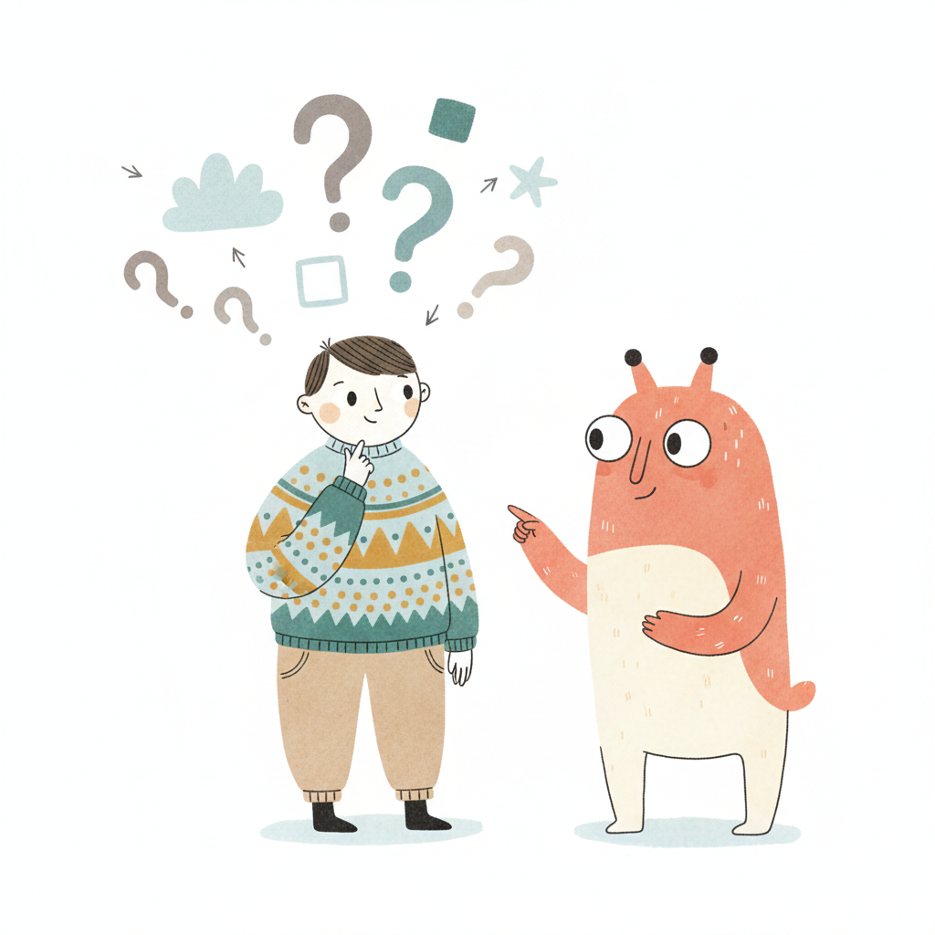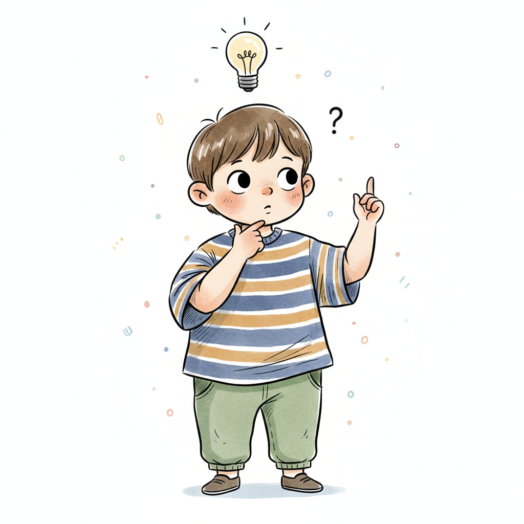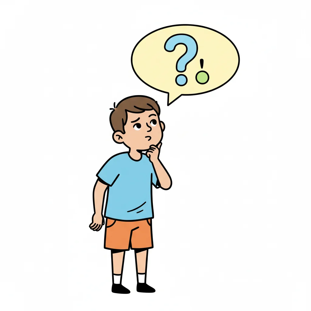 Ein nachdenklicher Cartoon-Junge mit Fragezeichen-Gedankenblase über dem Kopf.