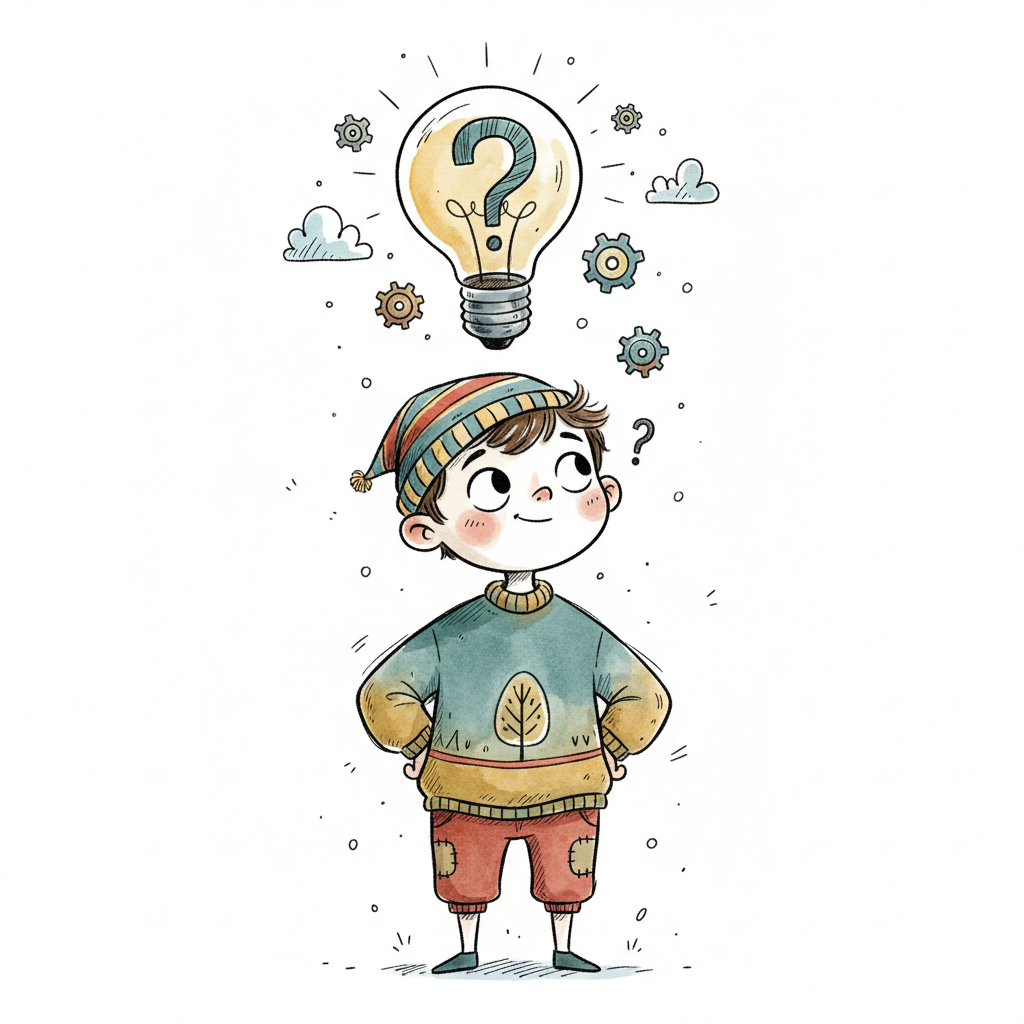 Cartoon-Junge denkt nach, über ihm eine Glühbirne mit Fragezeichen und Zahnrädern.