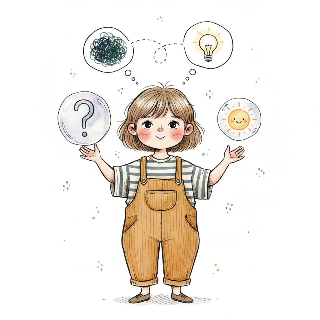 Niedliches Kind mit Gedankenblasen: Fragezeichen, Verwirrung, Idee und Sonne.