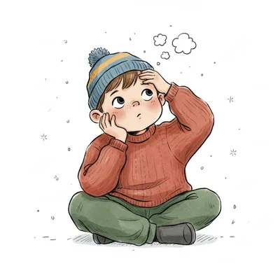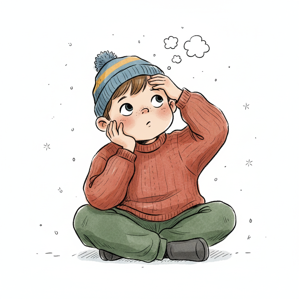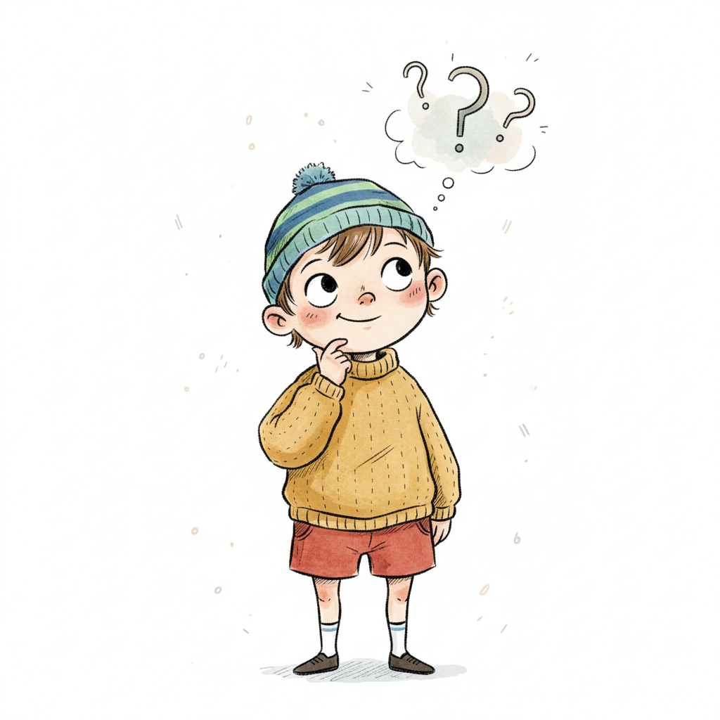 Ein nachdenklicher Cartoon-Junge mit Mütze und Pullover, Fragezeichen in Gedankenblase.