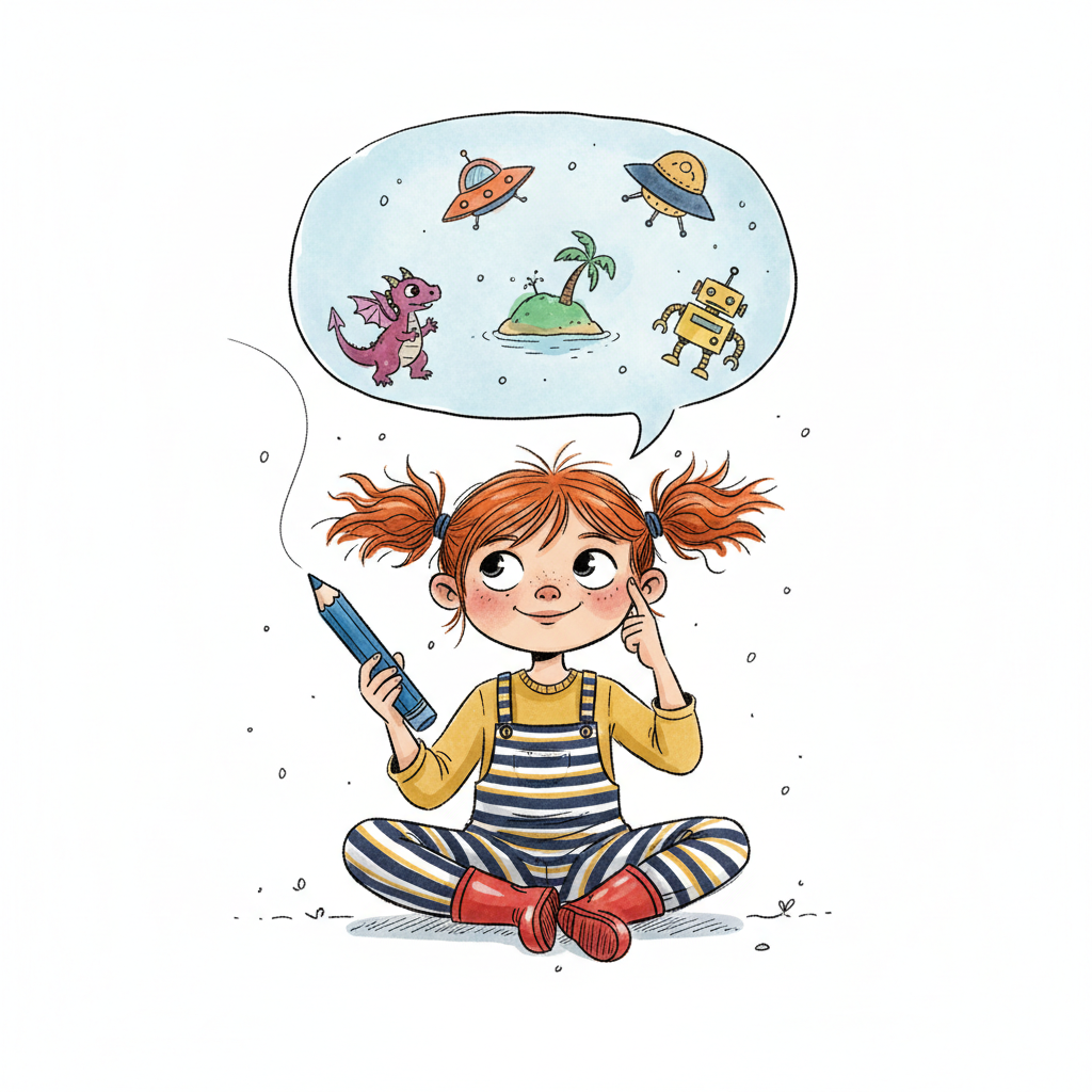 Kreatives Mädchen mit Bleistift stellt sich Drachen, UFOs und Roboter vor.