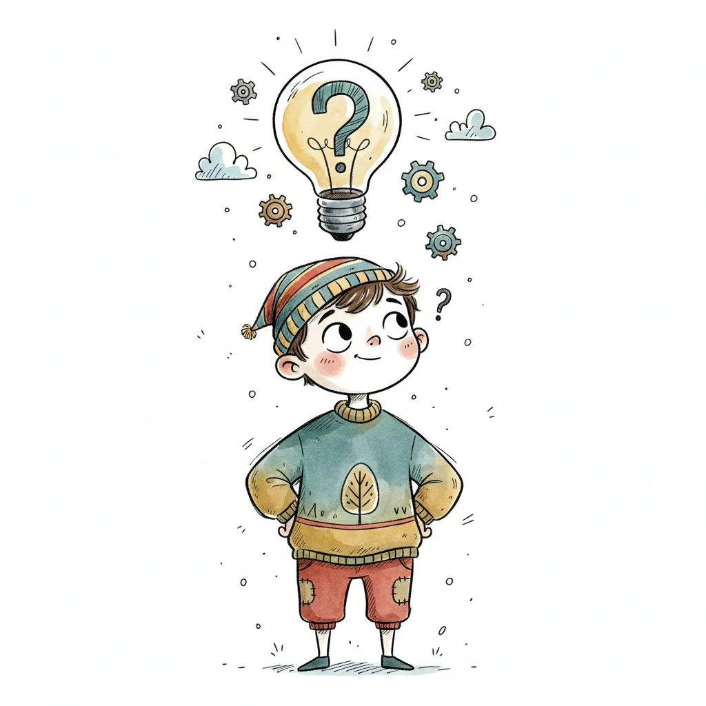 Ein nachdenklicher Cartoon-Junge mit Glühbirne und Fragezeichen, der eine Idee hat oder überlegt.
