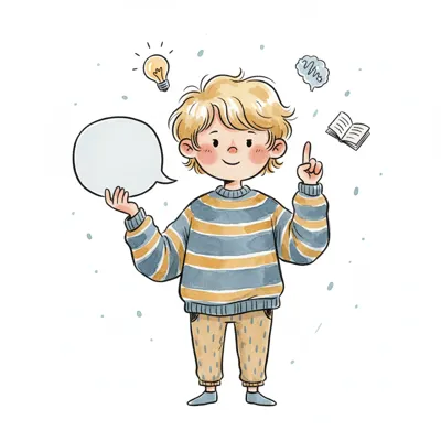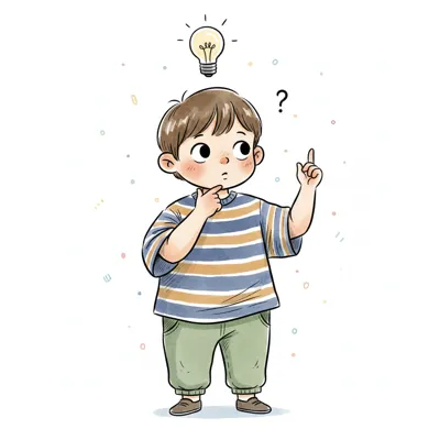 Ein Cartoon-Junge denkt nach, mit einem Fragezeichen und Ausrufezeichen in einer Sprechblase.