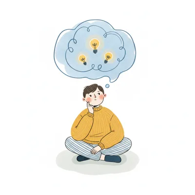 Ein nachdenklicher Mensch sitzt mit Ideen (Glühbirnen) in einer Gedankenblase über dem Kopf.