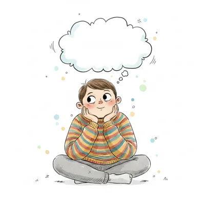 Niedlicher Cartoonjunge mit Mütze sitzt nachdenklich, mit Gedankenblasen über dem Kopf.