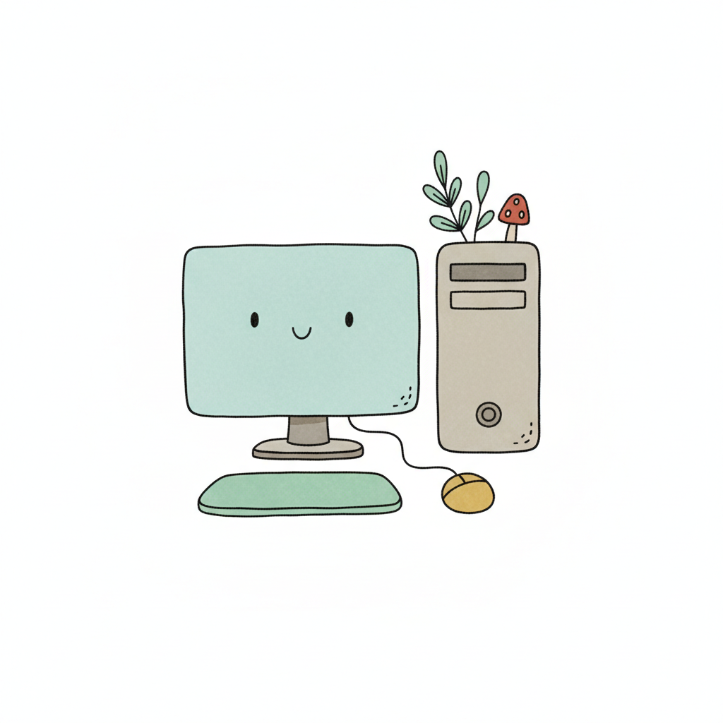 Niedlicher Cartoon-Computer mit lächelndem Bildschirm, PC-Turm mit Pflanze und Pilz.