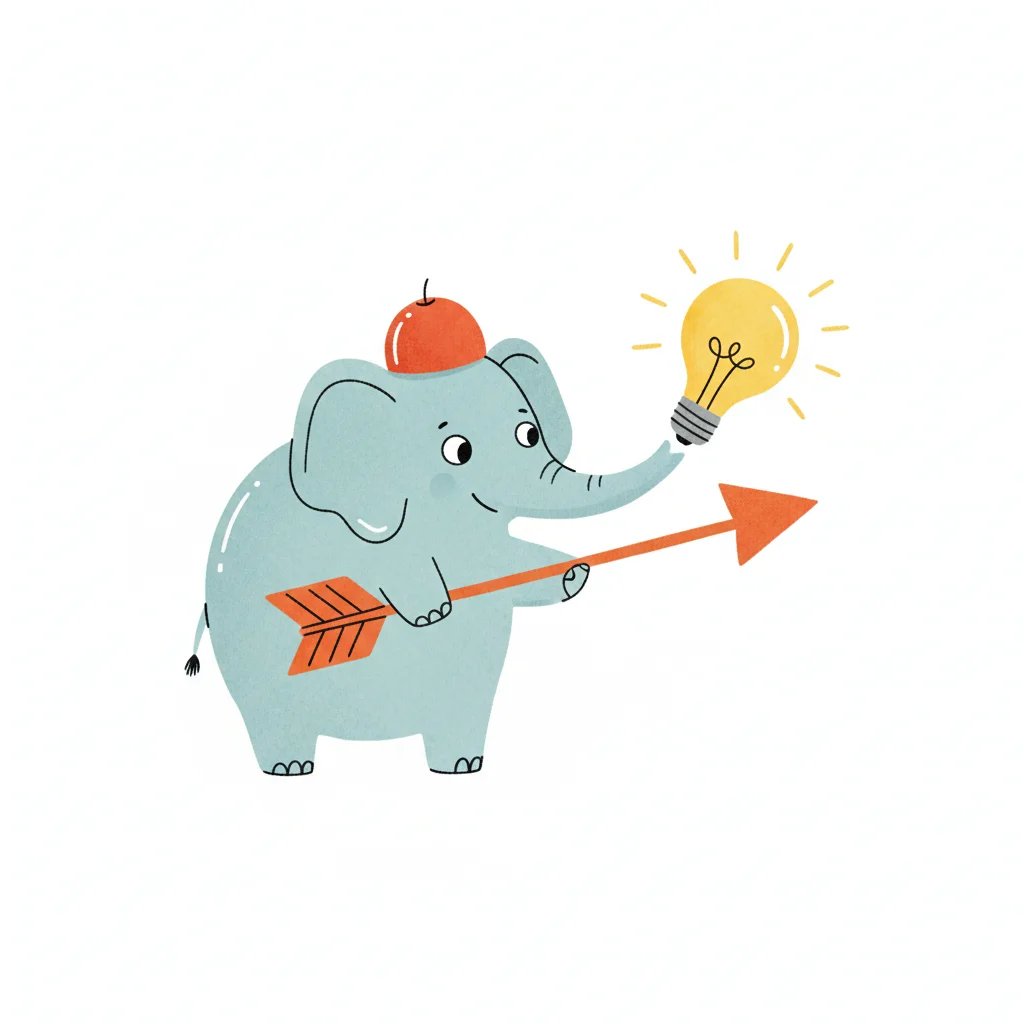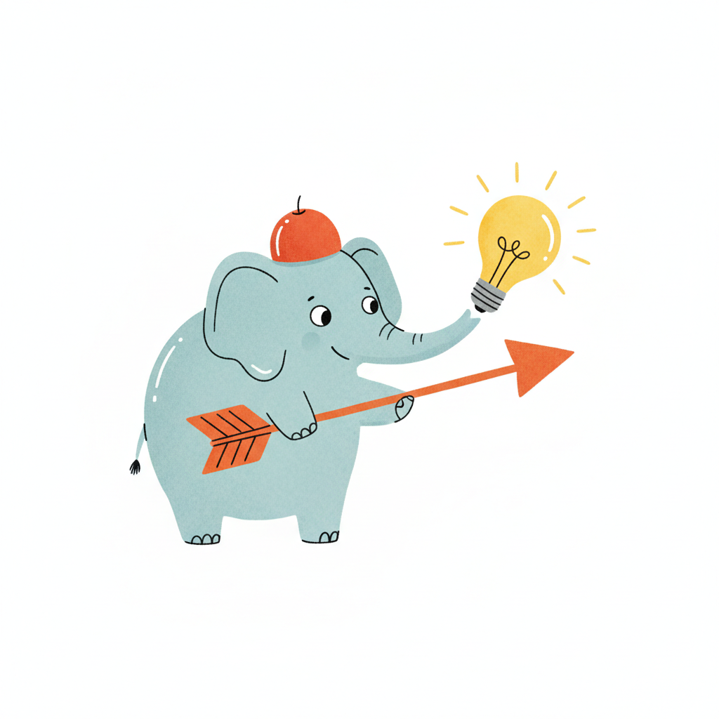 Niedlicher Elefant mit Apfel, der einen Pfeil hält und eine leuchtende Glühbirne präsentiert.