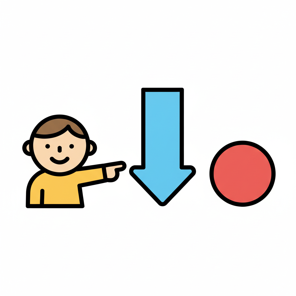 Cartoonfigur zeigt auf blauen Pfeil nach unten und roten Kreis.