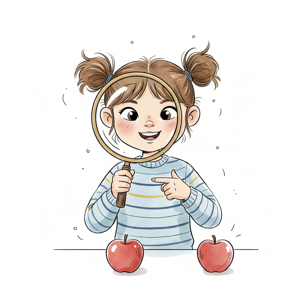 Ein fröhliches Mädchen mit Lupe betrachtet Äpfel und zeigt auf einen.