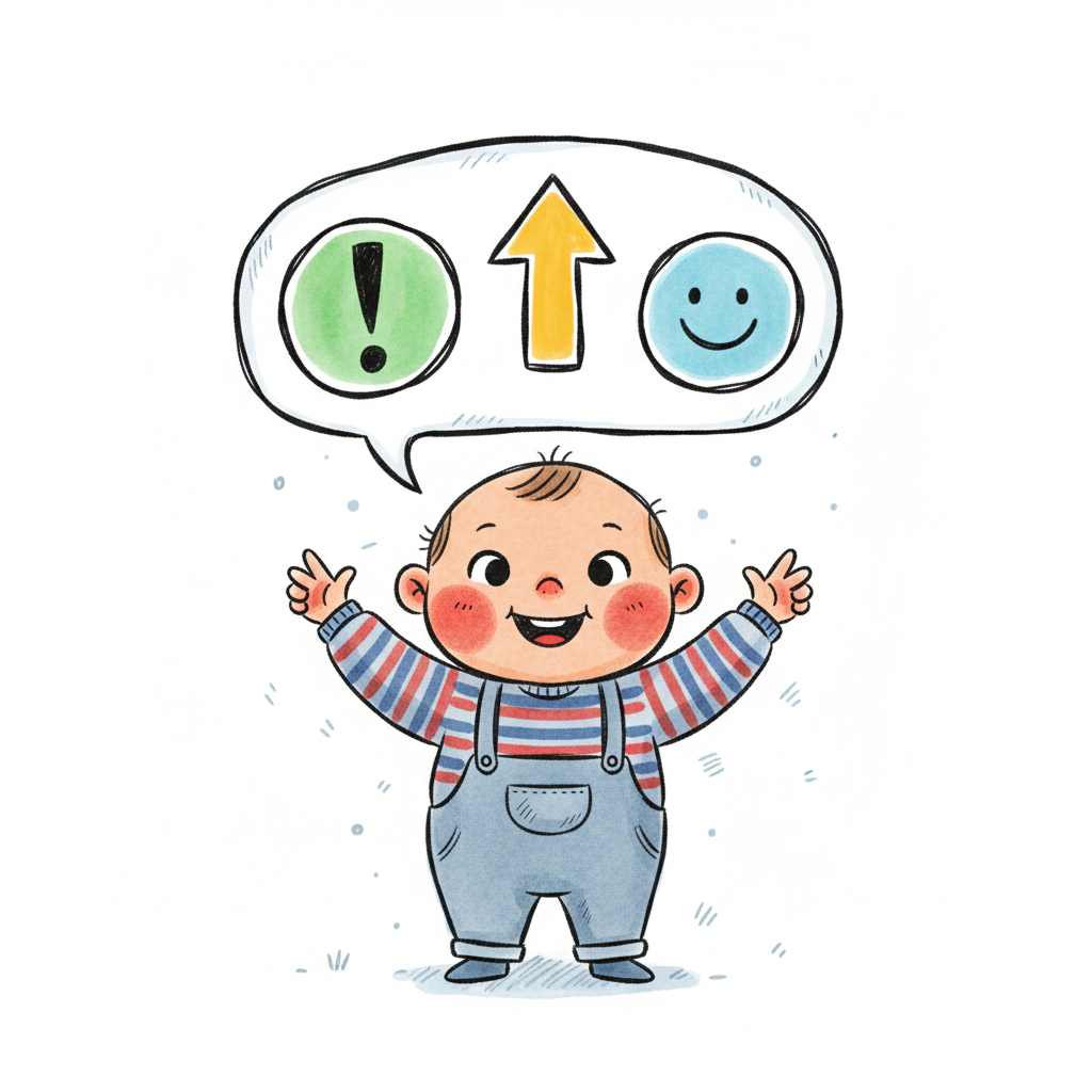 Glückliches Baby mit Gedankenblase voller positiver Symbole: Ausrufezeichen, Pfeil, Smiley.
