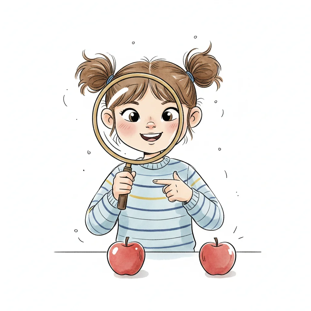 Ein Kind zeigt auf einen Apfel, der in einem Kreis hervorgehoben ist, mit weiteren Äpfeln im Hintergrund.