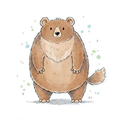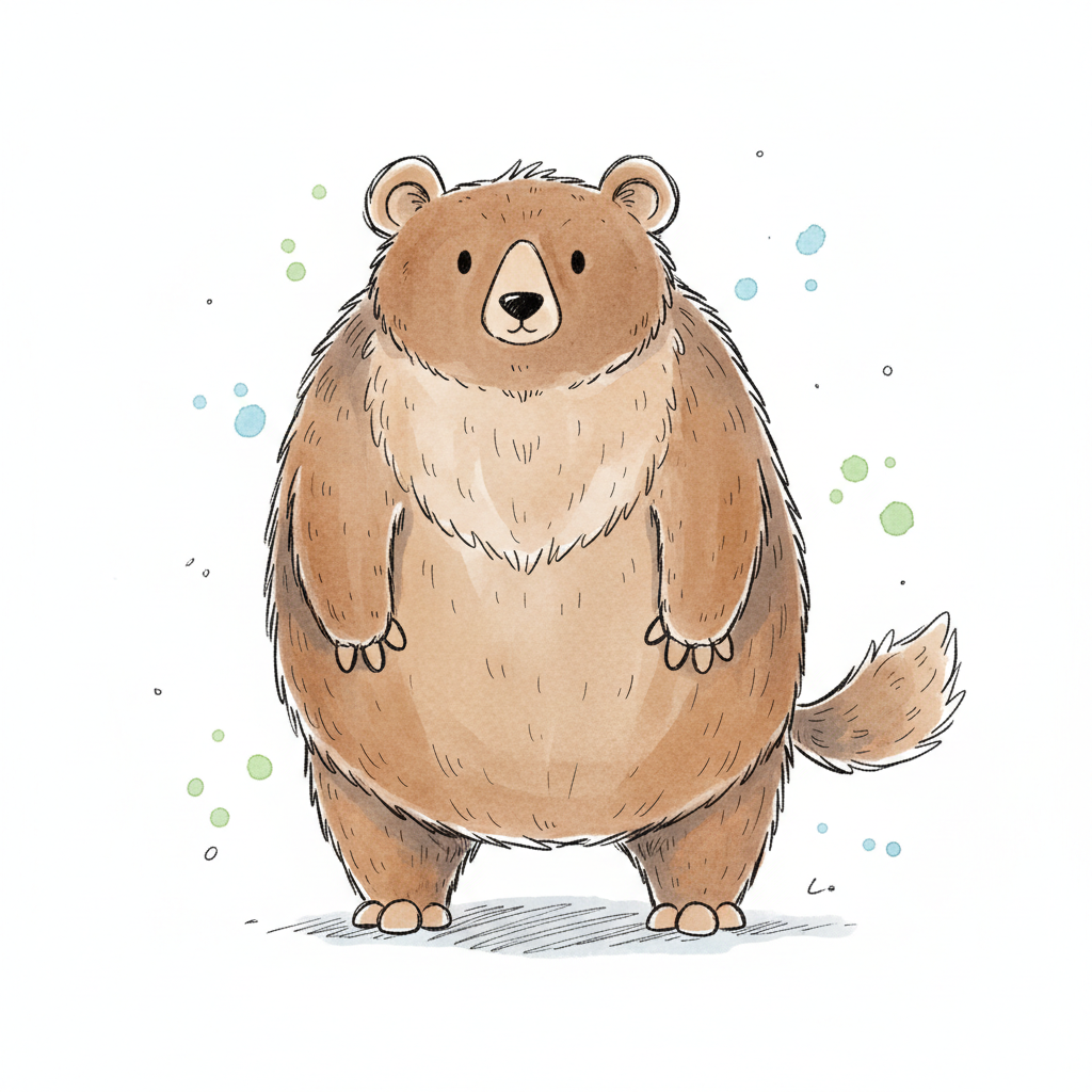 Ein süßer, dicker Cartoon-Bär in Aquarellfarben steht aufrecht, umgeben von Farbspritzern.