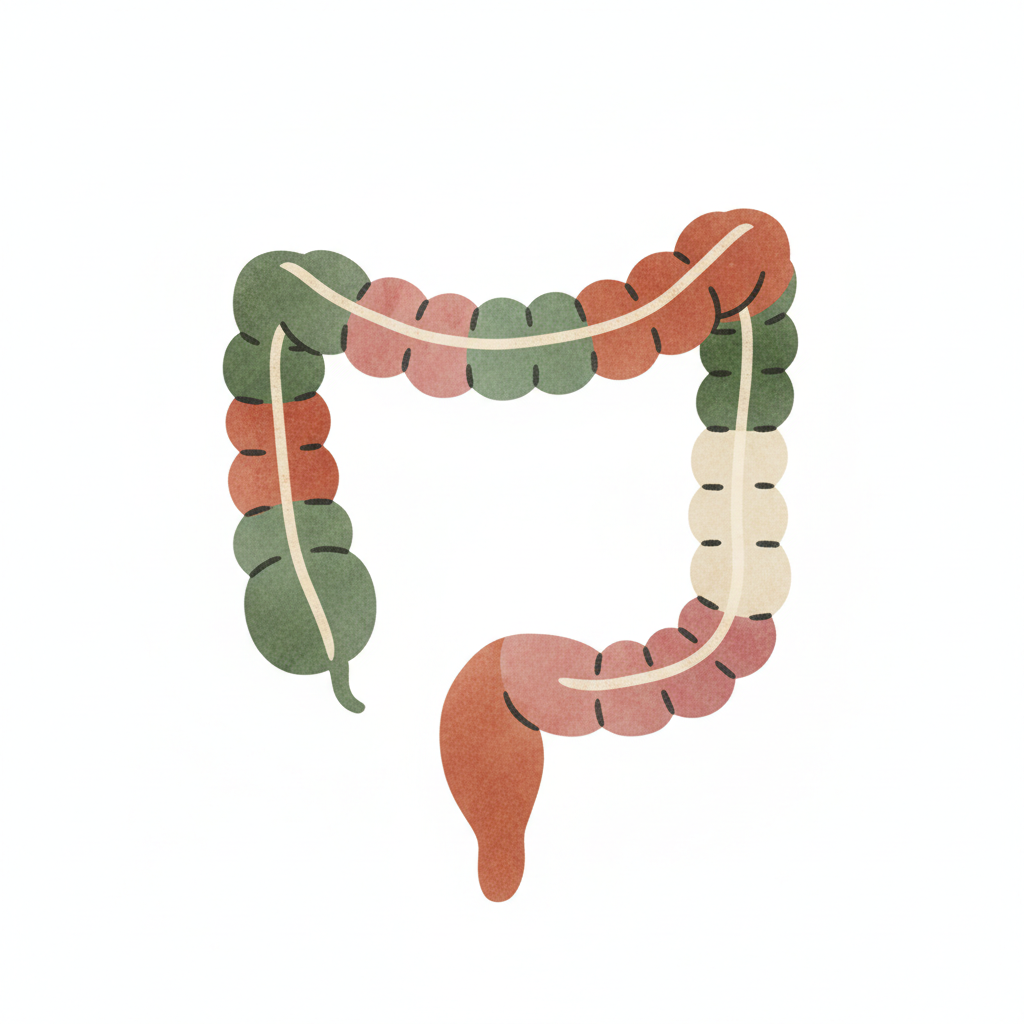 Stilisierte Illustration des menschlichen Dickdarms in Grün-, Rot- und Beigetönen mit Textur.