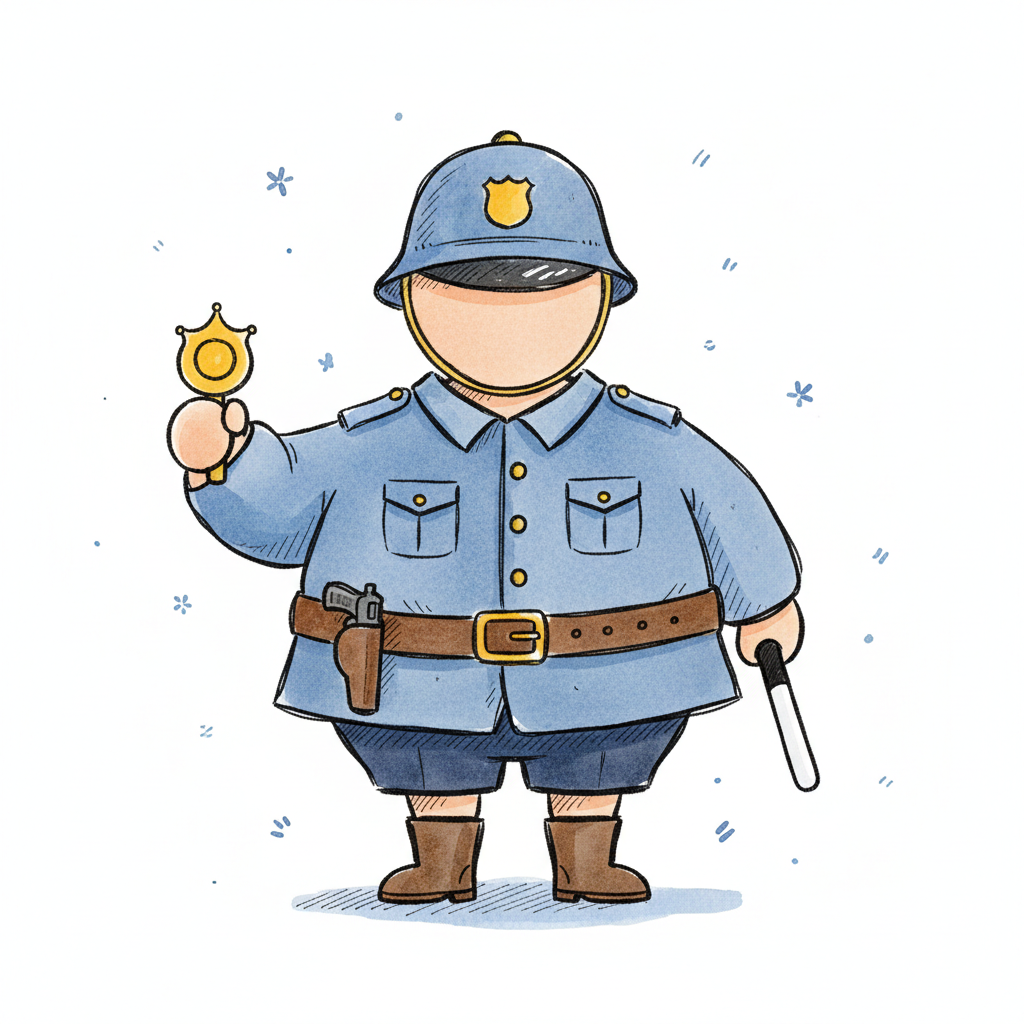 Niedlicher, dicker Cartoon-Polizist in blauer Uniform mit Abzeichen und Schlagstock.