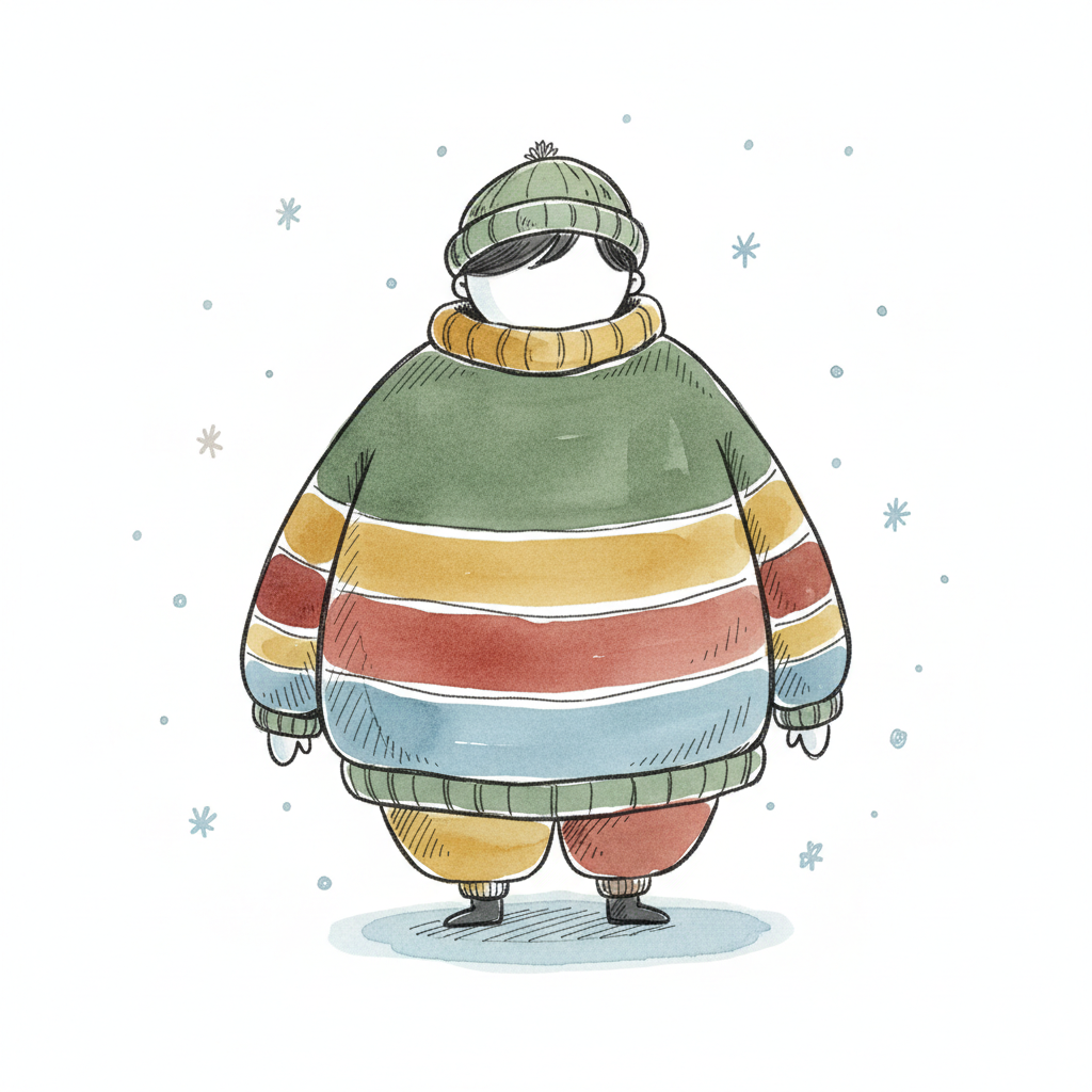 Niedliche, dick eingepackte Figur in gestreiftem Pullover und Mütze im Schnee.