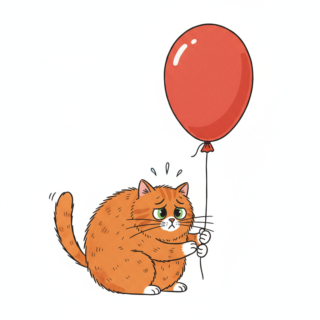 Eine ängstliche, dicke orangefarbene Katze hält einen roten Ballon fest.